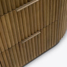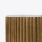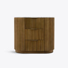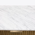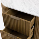 Crafted in pale natural oak with fluted detailing on all visible sides, it’s topped with Italian Carrara marble for a soft, sophisticated contrast. Three seamless drawers with slim brass pull handles offer practical storage, while the recessed base gives it a light, grounded presence.