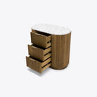 Use as a sleek statement bedside, a hallway organiser, or compact storage in smaller bedrooms or dressing areas. Pair with curved décor and layered neutral textiles for an effortless look.